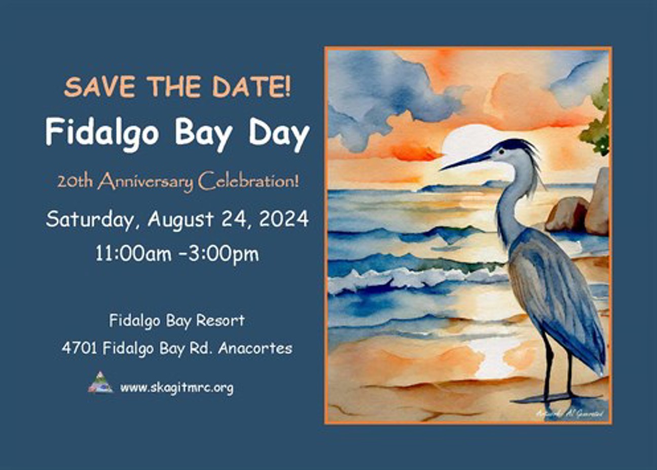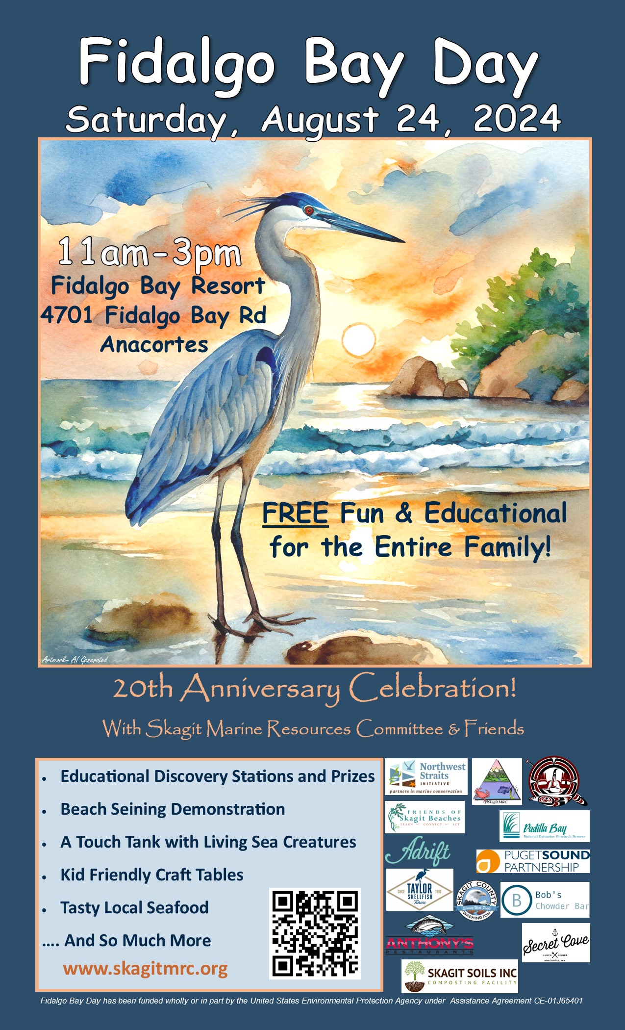 We hope you will join us to celebrate the 20th anniversary of our annual Fidalgo Bay Day event on Saturday, August 24, 2024, and learn something new about our amazing local estuaries and marine life. The event will be held from 11 am – 3 pm, at the Samish Indian Nation’s Fidalgo Bay Resort, located at 4701 Fidalgo Bay Road in Anacortes.