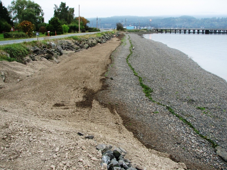 The West March’s Point Beach Nourishment Project was accomplished in collaboration with the Northwest Straits Foundation and the Skagit River System Cooperative and in cooperation with Tesoro, who owns the property. Skagit Restoration Initiative funds paid for 1,850 tons of sand and gravel to be placed in selected locations at West March’s Point as part of a larger project designed to restore sediment transport beach processes and enhance forage fish spawning habitat in the Fidalgo Bay nearshore. Volunteers collected pre- and post-construction data of forage fish spawning usage.
